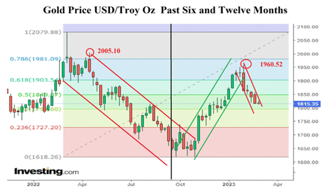 En la Figura 4, podemos ver el 2 de febrero un deslizamiento a la baja en el precio que anulo las ganancias de las sesiones previas. Esto vino seguido de un fuerte descenso del 2,79% el 3 de febrero, el cual marco el inicio de un canal correctivo de casi un mes de duracion.Aunque desde el 17 de febrero el precio migro hacia la parte superior del canal, la incapacidad de atacar mas de una vez su techo sugiere una sensacion de fatiga importante. Los precios tienen dificultades para moverse por encima de los 1815 - 1816 USD la onza troy, y eso implica que la perspectiva a corto plazo es de nuevos descensos hacia la actual media movil de 200 dias, en los 1838 USD/oz.Mucho dependera de la proxima ronda de lecturas de inflacion, el IPC de EEUU el 14 de marzo y el IPP el 15 de marzo, asi como las proximas decisiones sobre tasas de interes en los principales bancos centrales, en especial de la Fed el 22 de marzo.Si el IPC en los EEUU puede aguantar en el 6,4% o salir mas baja, esto permitiria a la Fed refrenarse de nuevo y moverse hacia otra subida de 25 pbs, del 4,5% al 5,00%. Por supuesto, muchos halcones siguen molestos porque no consiguieron una subida de 50 pbs la ultima vez, asi que en esta ocasion elevaran el tono de su retorica para lograr una subida mayor.Si se mantiene la posicion menos agresiva, y de hecho si se consolida, entonces es probable que en los proximos tres meses el oro caiga hacia los 1772 - 1782 USD/oz.