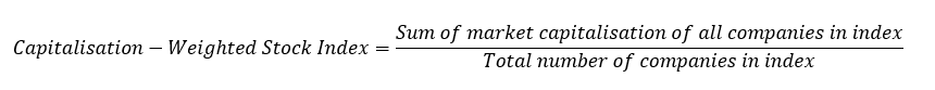 時価総額加重株式インデックス(S&P 500など)は、インデックス内のすべての企業の総価値を取り、その企業の数で割ることによって計算されます。これは、価格加重時価総額の計算方法と非常に似ています。以下の式は、時価総額加重株式インデックスの公式を示しています(企業の時価総額は、企業の株価にその企業の株数を掛けることによって得られることを覚えておくことが重要です):