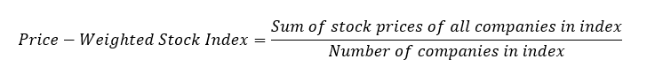 価格加重株式インデックス(ダウ・ジョーンズ工業株平均など)は、インデックス内のすべての企業の株価の合計を取り、そのインデックス内の企業の数で割ることによって計算されます。この公式は以下の通りです: