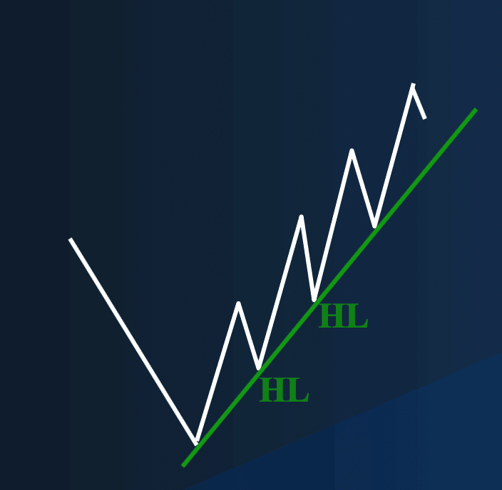 Uma tendência de alta é uma série de máximas e mínimas mais altas. Como você verá na imagem abaixo, a linha de tendência é desenhada conectando mínimas de oscilações sucessivas que definem a tendência de alta. Você pode usar essa linha de tendência de alta como suporte.