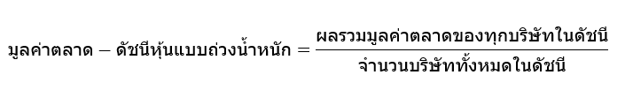 ดัชนีหุ้นแบบถ่วงน้ำหนักด้วยมูลค่าตลาด เช่น ดัชนีเอสแอนด์พี 500 คำนวณโดยนำมูลค่ารวมของบริษัททั้งหมดในดัชนีมาหารด้วยจำนวนบริษัทเหล่านี้ คล้ายกับการคำนวณมูลค่าตลาดที่ถ่วงน้ำหนักด้วยราคา สมการด้านล่างคือสูตรสำหรับดัชนีหุ้นแบบถ่วงน้ำหนักมูลค่าตลาด (ข้อสำคัญคือต้องจำไว้ว่ามูลค่ารวม หรือมูลค่าหลักทรัพย์ตามราคาตลาด จะมาจากการคูณราคาของหุ้นของบริษัทนั้นด้วยจำนวนหุ้น)