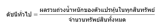 สูตรคำนวณที่ระบุไว้ข้างต้นเป็นสูตรคำนวณทั่วไปสำหรับดัชนีทุกประเภท แต่มีวิธีเฉพาะในการคำนวณดัชนีหุ้นประเภทต่างๆ ซึ่งเราจะพิจารณาตามคำจำกัดความทางคณิตศาสตร์ด้านล่าง