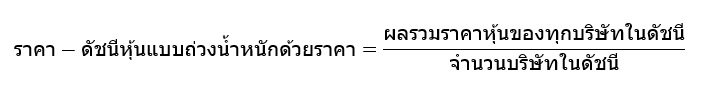 ดัชนีหุ้นแบบถ่วงน้ำหนักด้วยราคา เช่น ดัชนีอุตสาหกรรมดาวโจนส์ คำนวณโดยนำผลรวมของบริษัททั้งหมดในราคาหุ้นของดัชนีแล้วหารด้วยจำนวนบริษัทในดัชนีนั้น ดูสูตรคำนวณสำหรับดัชนีนี้ได้ด้านล่าง: