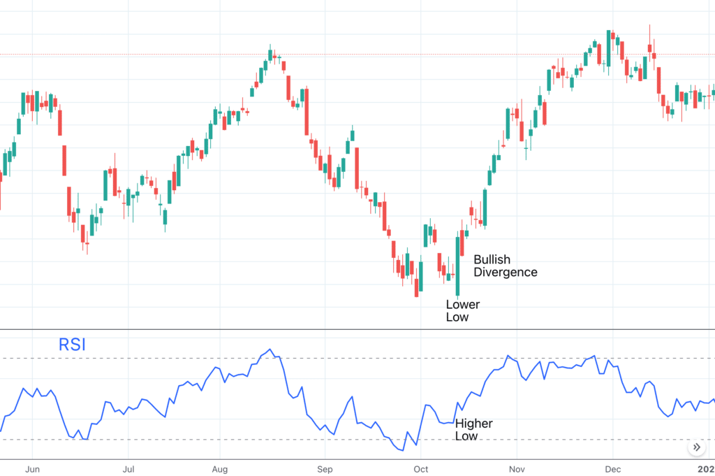 สัญญาณกลับตัวเป็นตลาดกระทิงเกิดขึ้นเมื่อราคาของสินทรัพย์ลงต่ำกว่าจุดต่ำสุด ในขณะที่ตัวบ่งชี้กำลังทำจุดต่ำสุดที่สูงขึ้น สัญญาณนี้คือสัญญาณที่เป็นไปได้ว่าแนวโน้มกำลังจะกลับตัวจากตลาดหมีเป็นตลาดกระทิง
